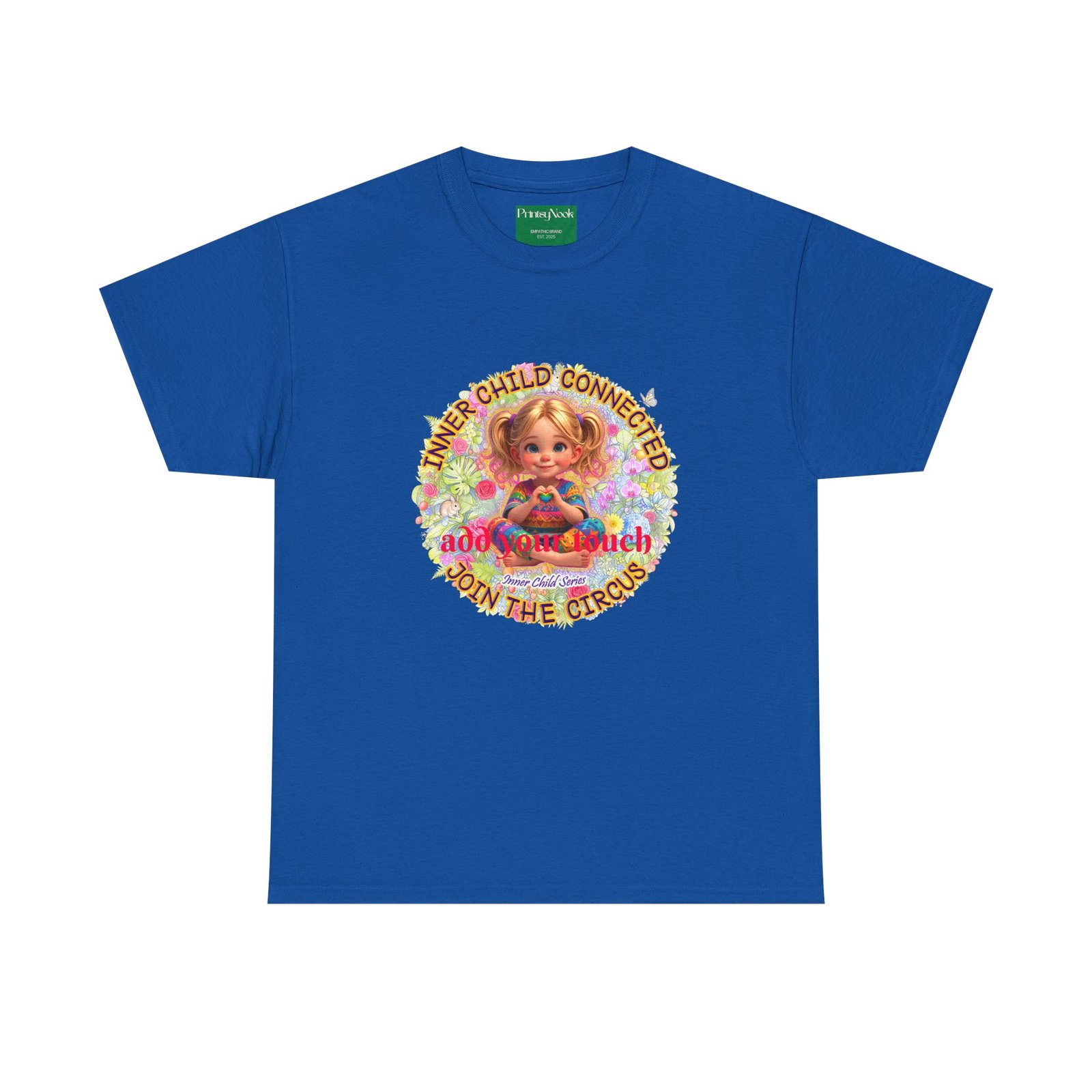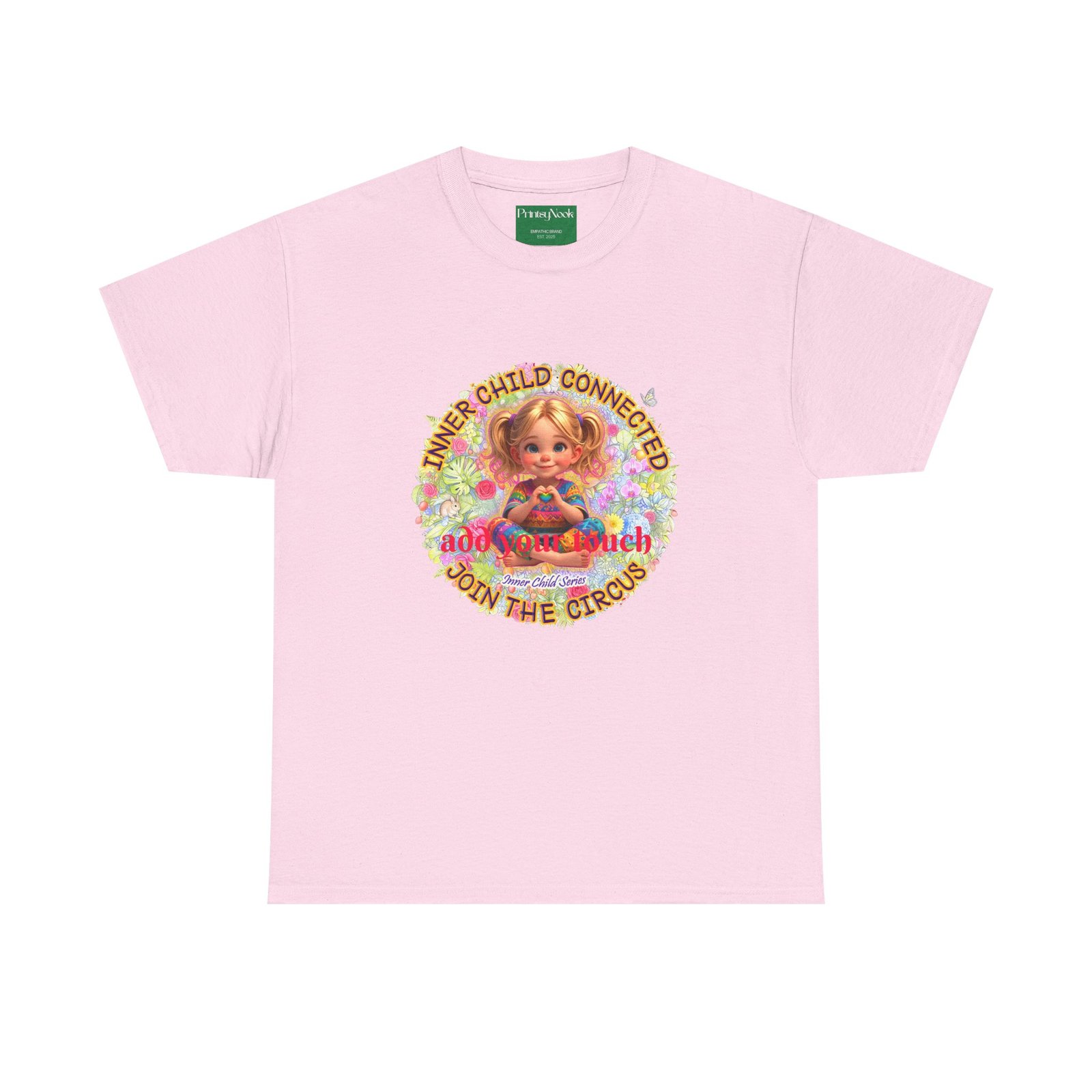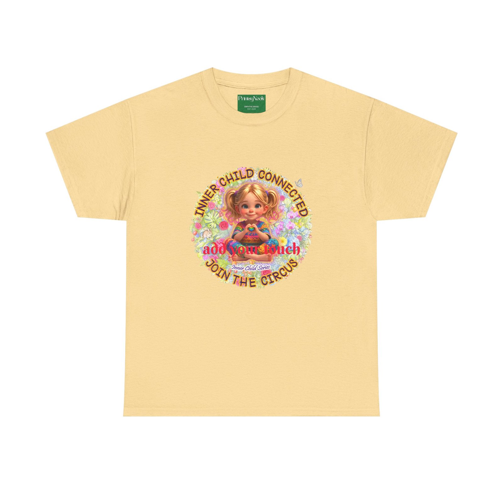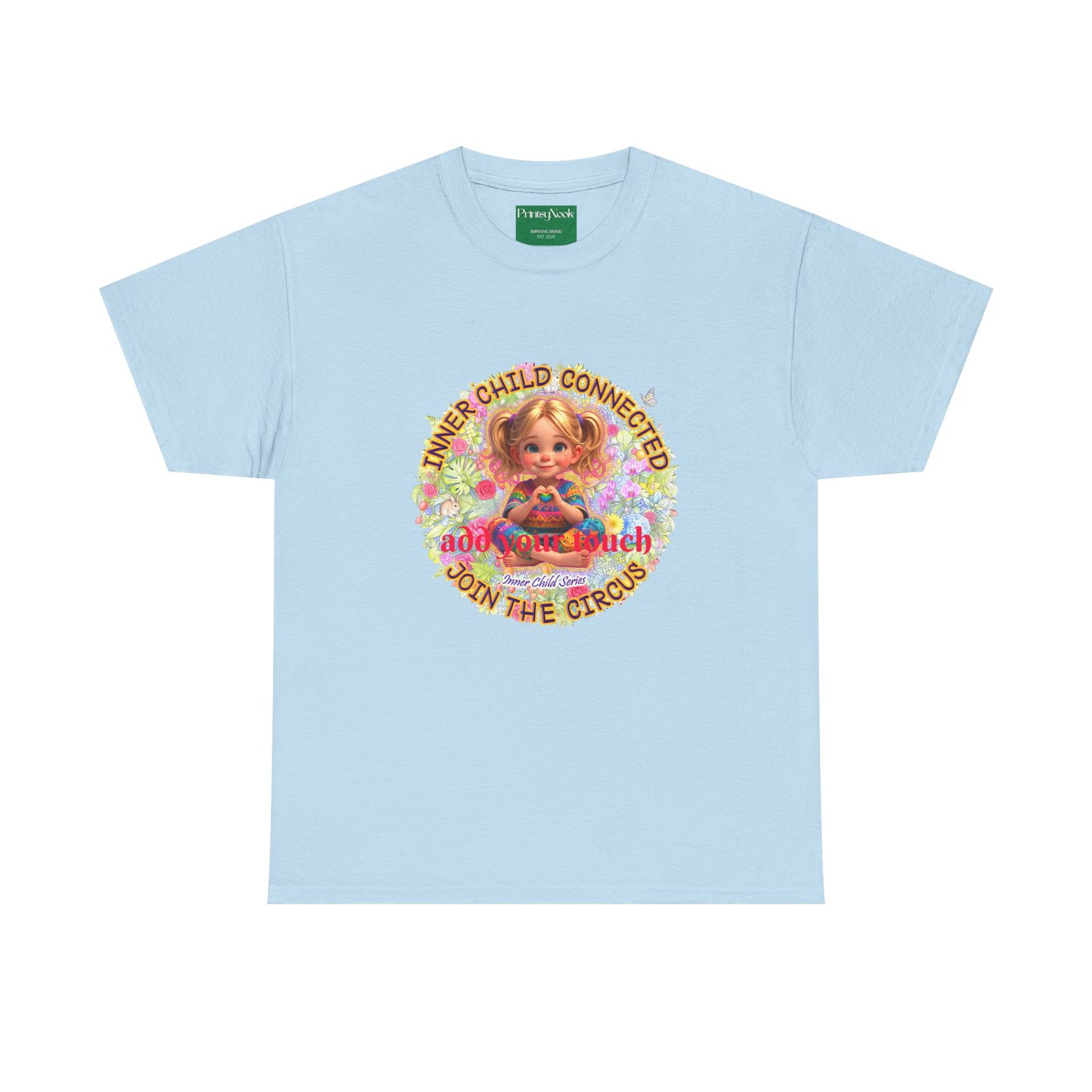 Especially for blonde, blue eyed girls. This cotton tee is an invitation to all girls who feel that its time to reunite with our inner innocence and wisdom and grow into a united people around the globe. The artwork — a girl surrounded by a line of text — states the connection with her inner child and bring tenderness, innocence and wisdom into the world. The artwork can be personalized by adding your name or a few words to make it your unique expression. Just add it at Checkout into "add additional note" box. Else we leave that space on the product empty. Ask yourself, what is the common grounds among all people? As a people shouldn´t we focus on acting based on mutual consent? It doesn´t mean, that we have to give up our special uniqueness. Values like Love, Peace and Freedom are universal. Wear it when you want your clothes to speak softly but clearly: a reminder that healing begins with connection, and that unity, not division, will shape our future. The medium-weight fabric and clean crew neck give it a lived-in comfort that layers easily under jackets or stands on its own at community gatherings, rallies, or casual days when you want to feel seen and steady. The natural tones and thoughtful print blend into everyday life while still making a thoughtful, humane, catching and unifying statement.