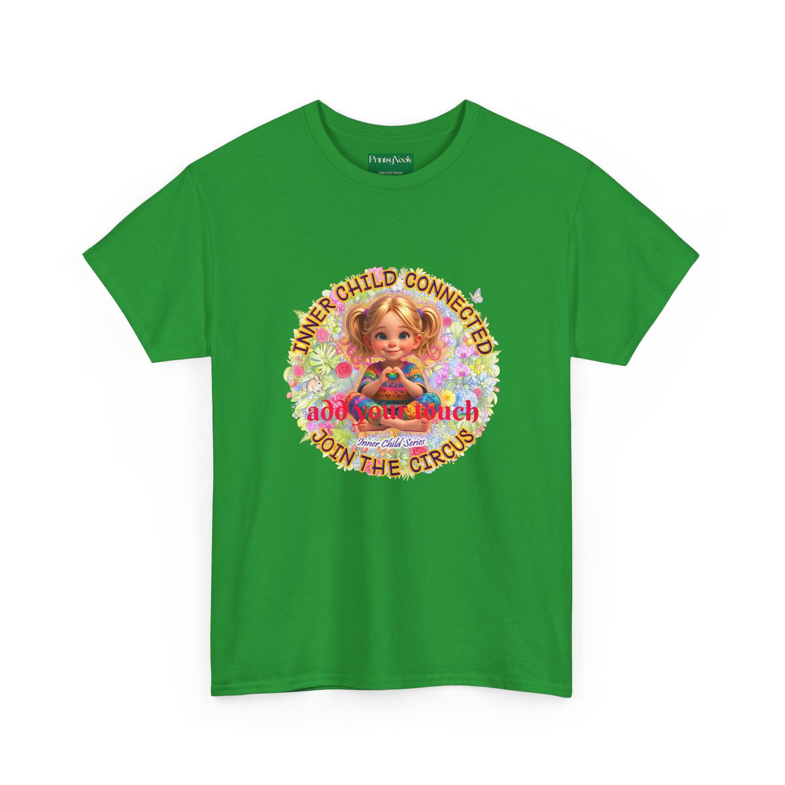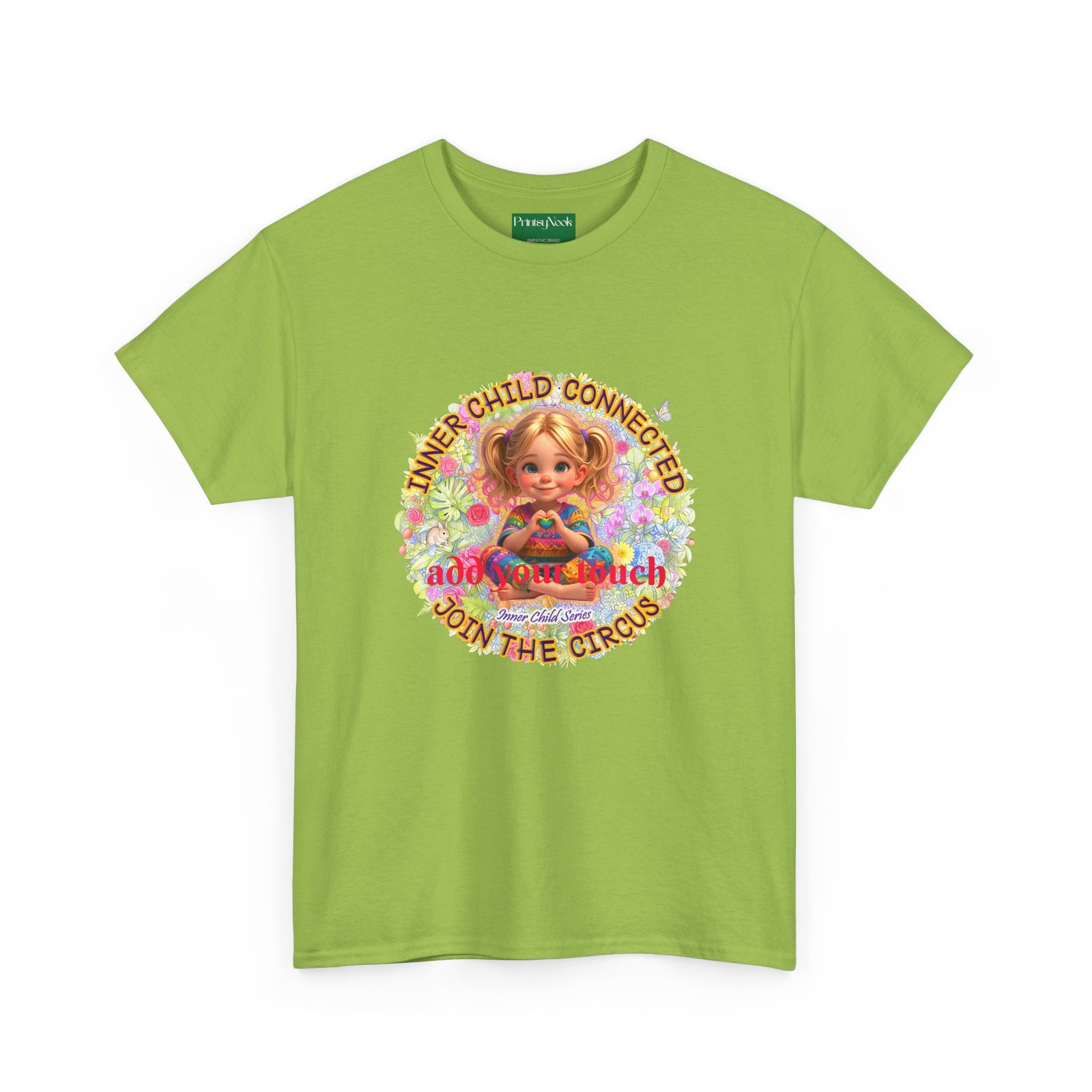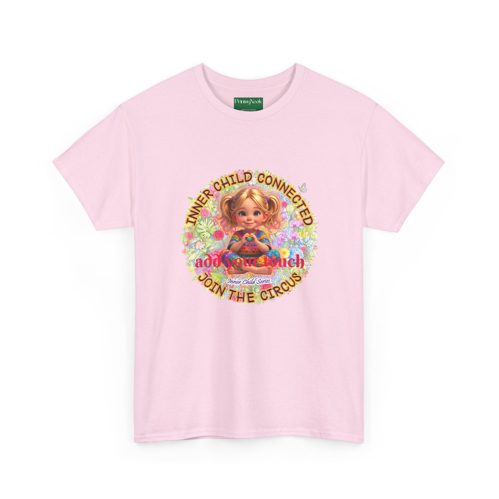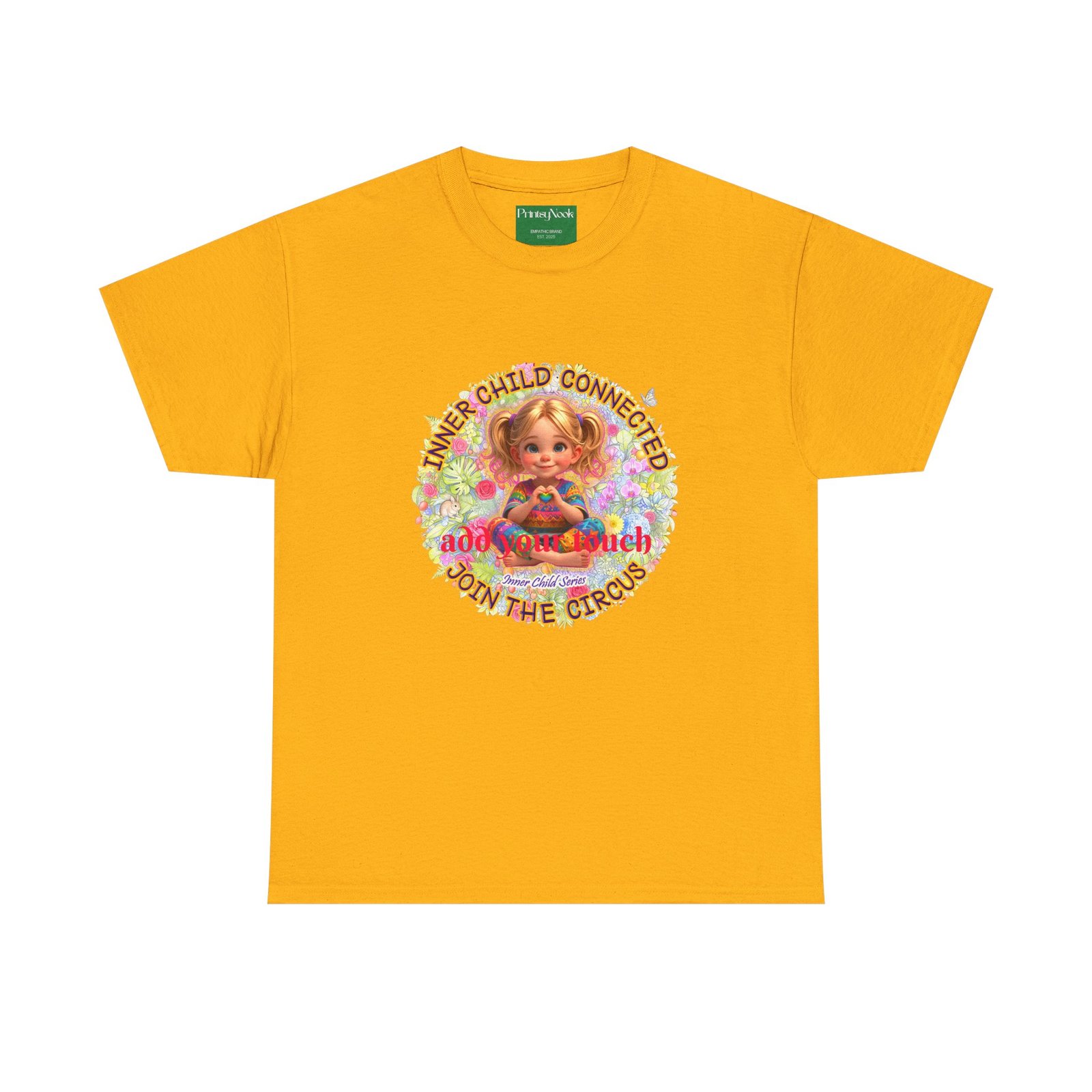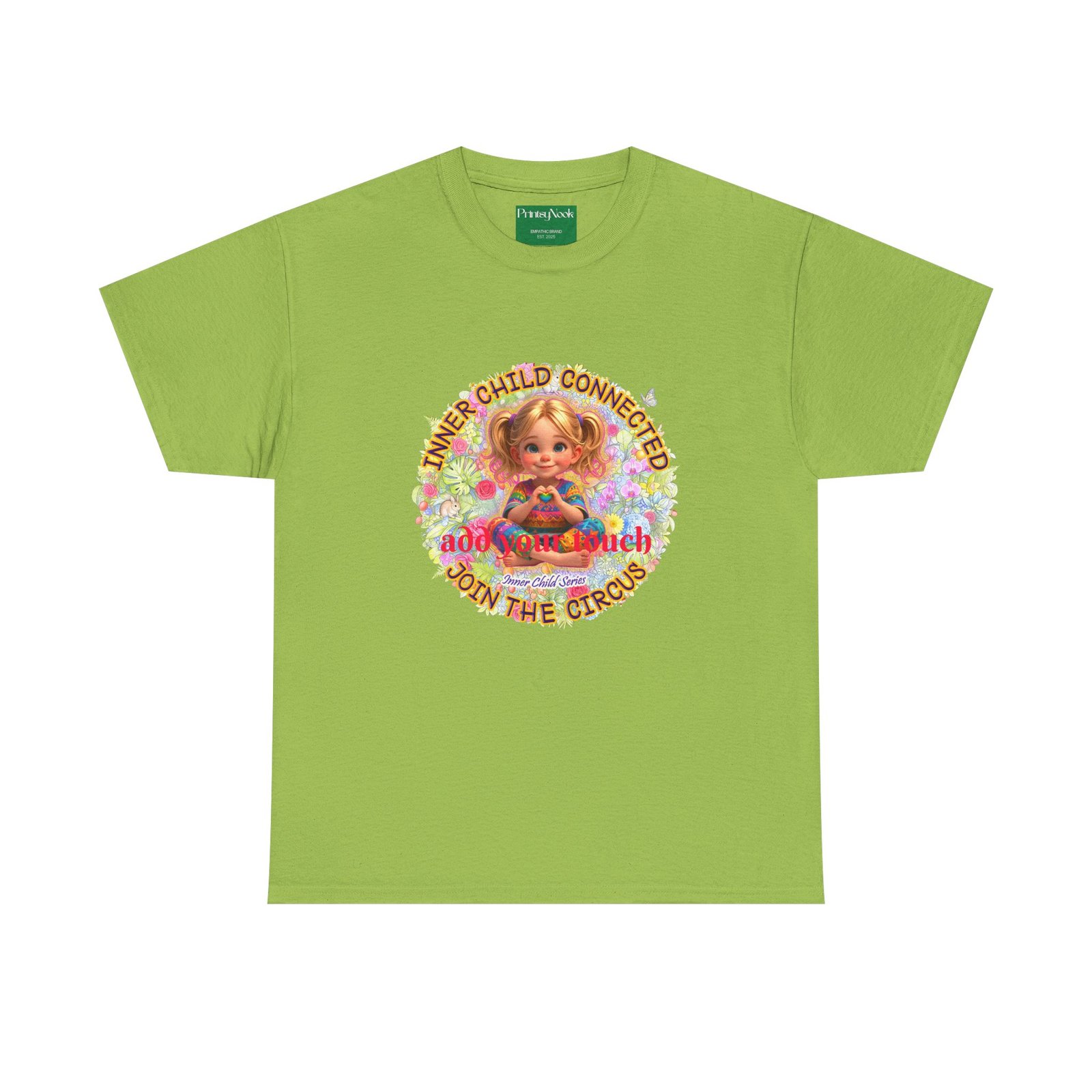 Especially for blonde, blue eyed girls. This cotton tee is an invitation to all girls who feel that its time to reunite with our inner innocence and wisdom and grow into a united people around the globe. The artwork — a girl surrounded by a line of text — states the connection with her inner child and bring tenderness, innocence and wisdom into the world. The artwork can be personalized by adding your name or a few words to make it your unique expression. Just add it at Checkout into "add additional note" box. Else we leave that space on the product empty. Ask yourself, what is the common grounds among all people? As a people shouldn´t we focus on acting based on mutual consent? It doesn´t mean, that we have to give up our special uniqueness. Values like Love, Peace and Freedom are universal. Wear it when you want your clothes to speak softly but clearly: a reminder that healing begins with connection, and that unity, not division, will shape our future. The medium-weight fabric and clean crew neck give it a lived-in comfort that layers easily under jackets or stands on its own at community gatherings, rallies, or casual days when you want to feel seen and steady. The natural tones and thoughtful print blend into everyday life while still making a thoughtful, humane, catching and unifying statement.