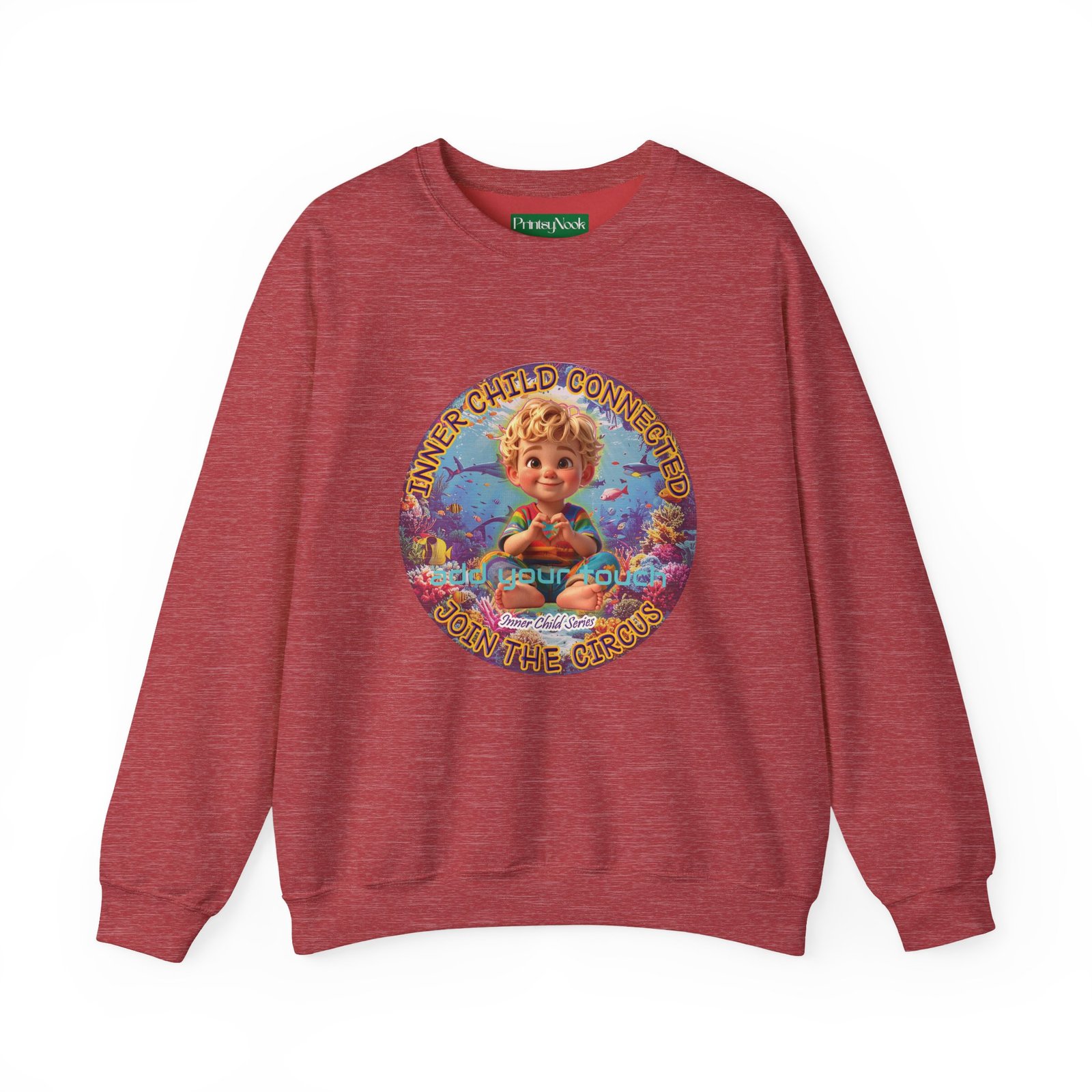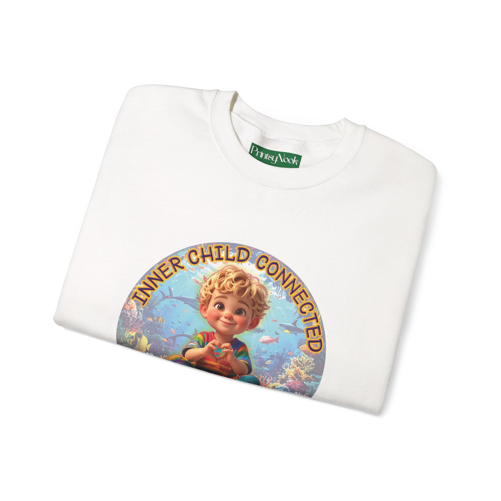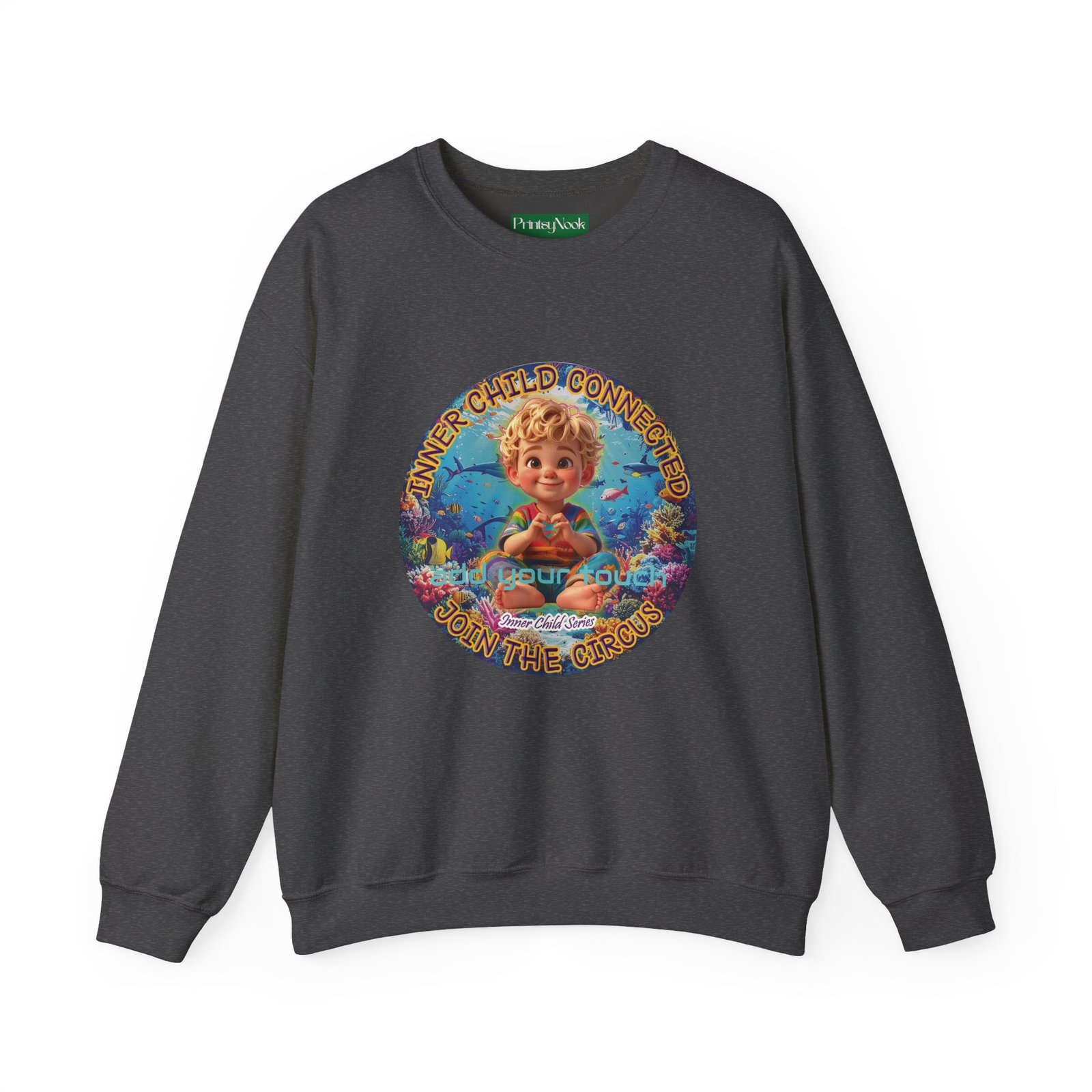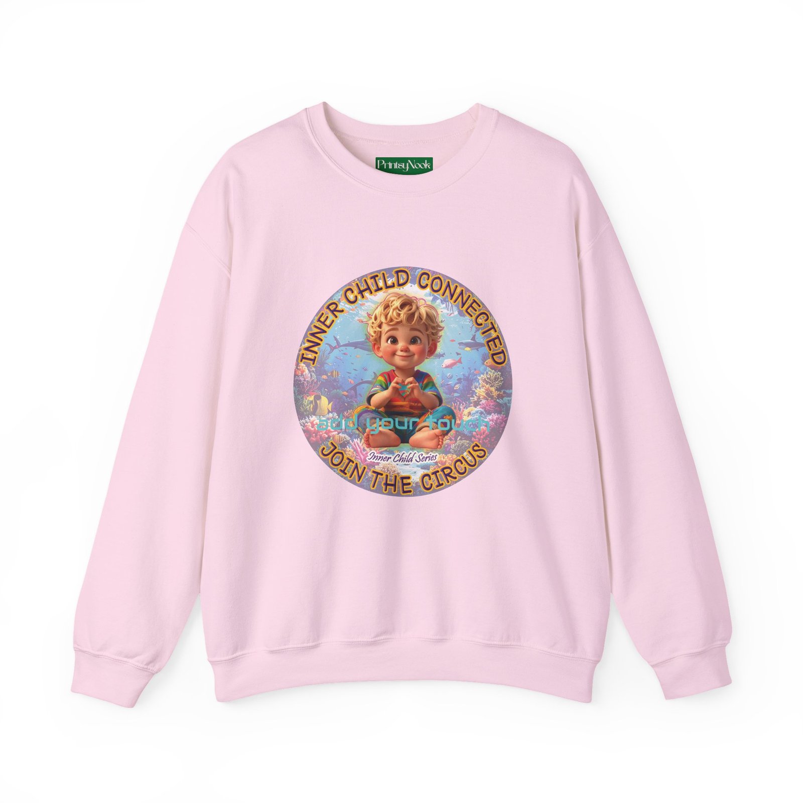 Especially for blonde brown eyed boys and delivery within the Americas. Soft, cozy, and touching within — this crewneck wraps you in a quiet, playful mood. The front features a cheerful, vintage-inspired illustration of a wide-eyed child surrounded by pastel bubbles and warm text that reads an invitation to reconnect with your inner wonder. The artwork can be personalized by adding your name or a few words to make it your unique expression. Just add it at Checkout into "add additional note" box. Else we leave that space on the product empty. Wear it on slow mornings, at cozy gatherings, or when you want a gentle reminder to slow down and smile. The medium-heavy cotton blend and ribbed collar keep the shape through repeated wear, while the tubular knit construction gives a clean, seamless silhouette. Subtle embroidery placement options and tear-away neck labels keep comfort at the center of the design.