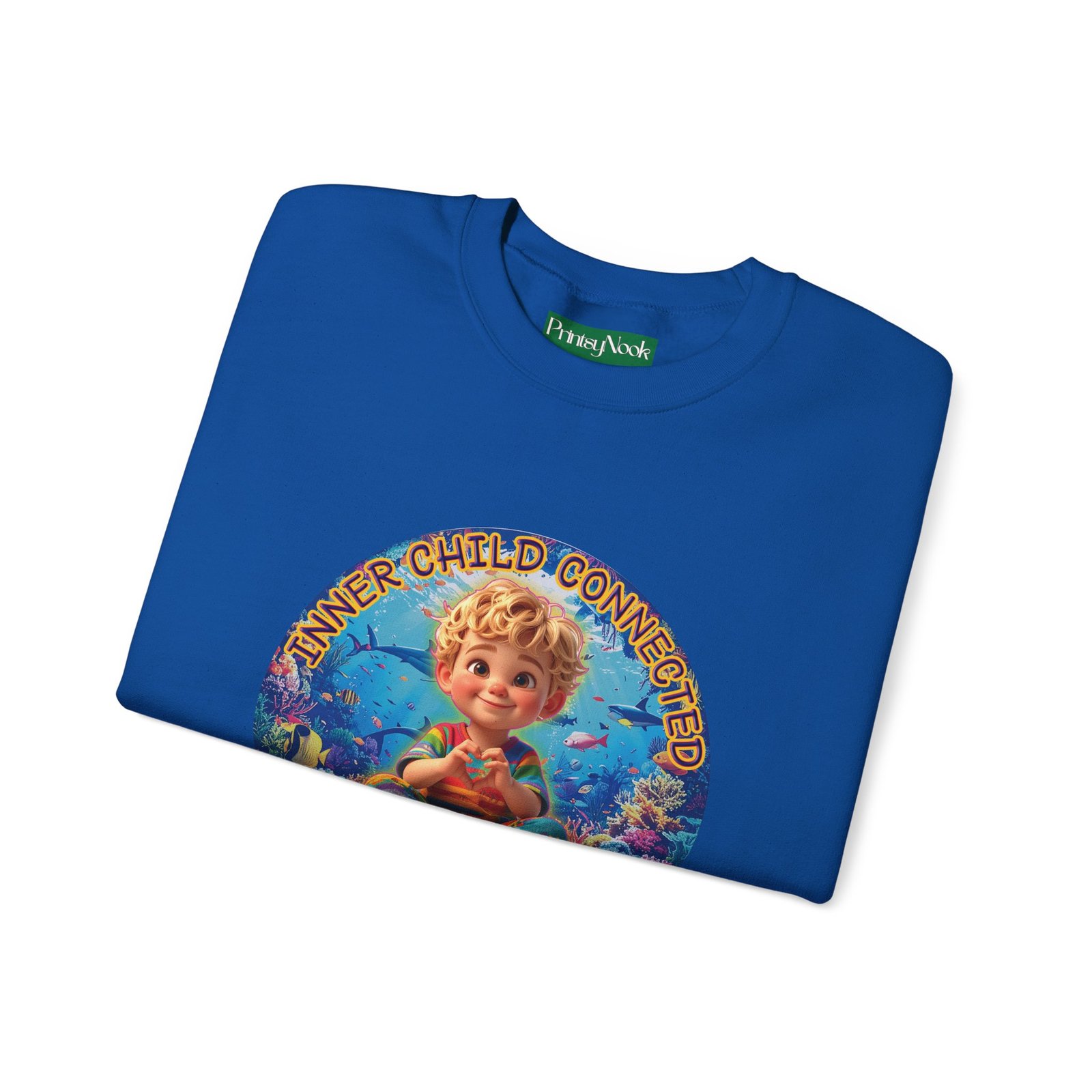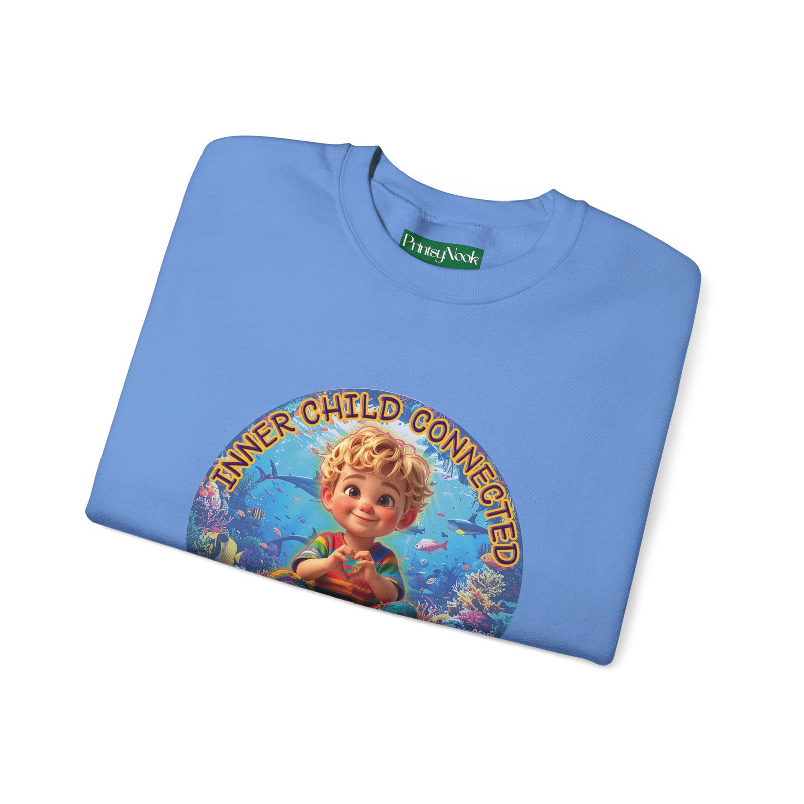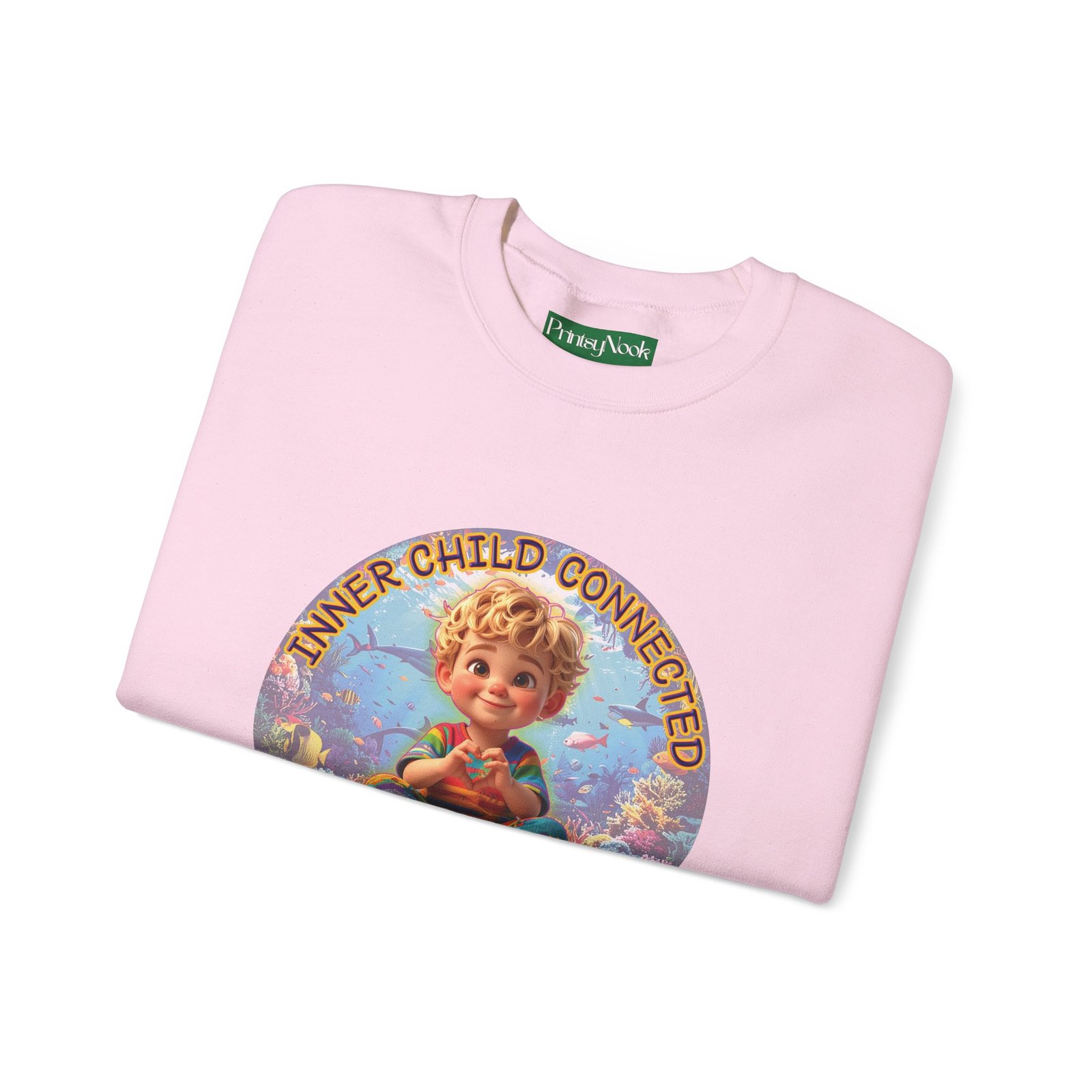 Especially for blonde brown eyed boys and delivery within the Americas. Soft, cozy, and touching within — this crewneck wraps you in a quiet, playful mood. The front features a cheerful, vintage-inspired illustration of a wide-eyed child surrounded by pastel bubbles and warm text that reads an invitation to reconnect with your inner wonder. The artwork can be personalized by adding your name or a few words to make it your unique expression. Just add it at Checkout into "add additional note" box. Else we leave that space on the product empty. Wear it on slow mornings, at cozy gatherings, or when you want a gentle reminder to slow down and smile. The medium-heavy cotton blend and ribbed collar keep the shape through repeated wear, while the tubular knit construction gives a clean, seamless silhouette. Subtle embroidery placement options and tear-away neck labels keep comfort at the center of the design.