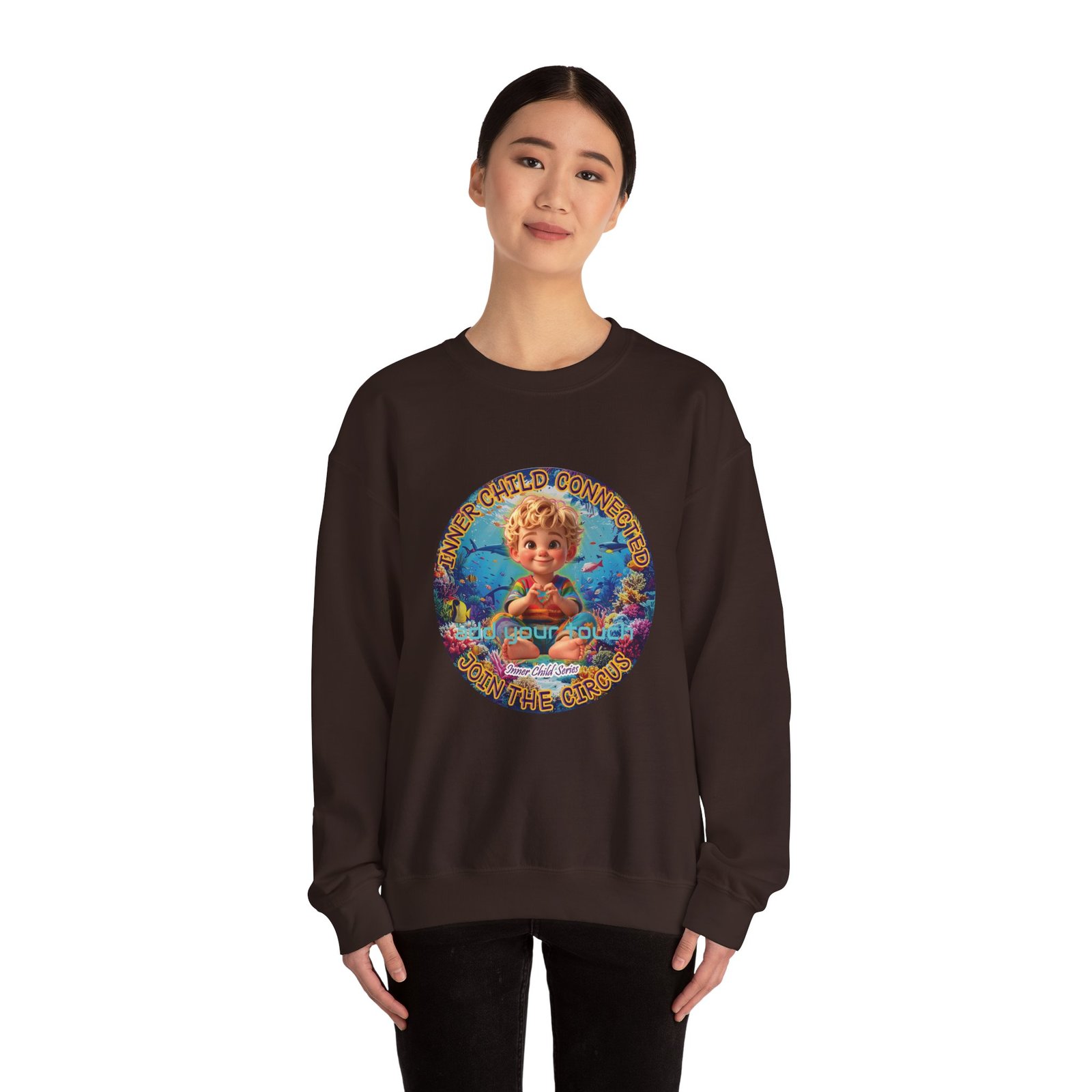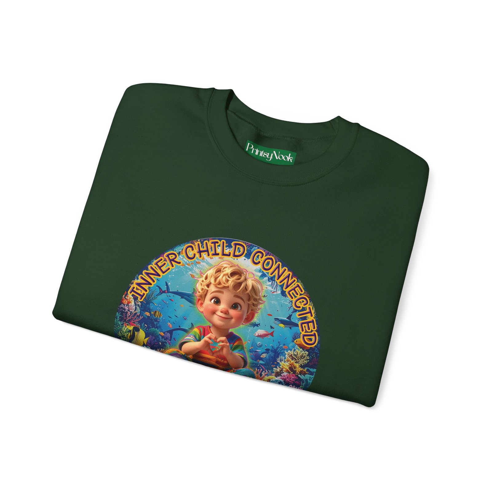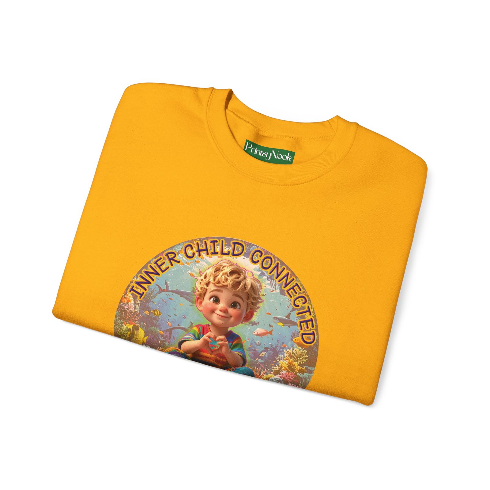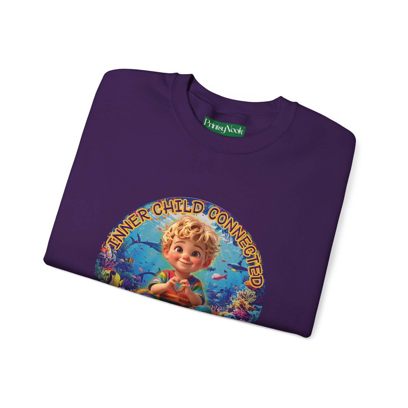 Especially for blonde brown eyed boys and delivery within the Americas. Soft, cozy, and touching within — this crewneck wraps you in a quiet, playful mood. The front features a cheerful, vintage-inspired illustration of a wide-eyed child surrounded by pastel bubbles and warm text that reads an invitation to reconnect with your inner wonder. The artwork can be personalized by adding your name or a few words to make it your unique expression. Just add it at Checkout into "add additional note" box. Else we leave that space on the product empty. Wear it on slow mornings, at cozy gatherings, or when you want a gentle reminder to slow down and smile. The medium-heavy cotton blend and ribbed collar keep the shape through repeated wear, while the tubular knit construction gives a clean, seamless silhouette. Subtle embroidery placement options and tear-away neck labels keep comfort at the center of the design.