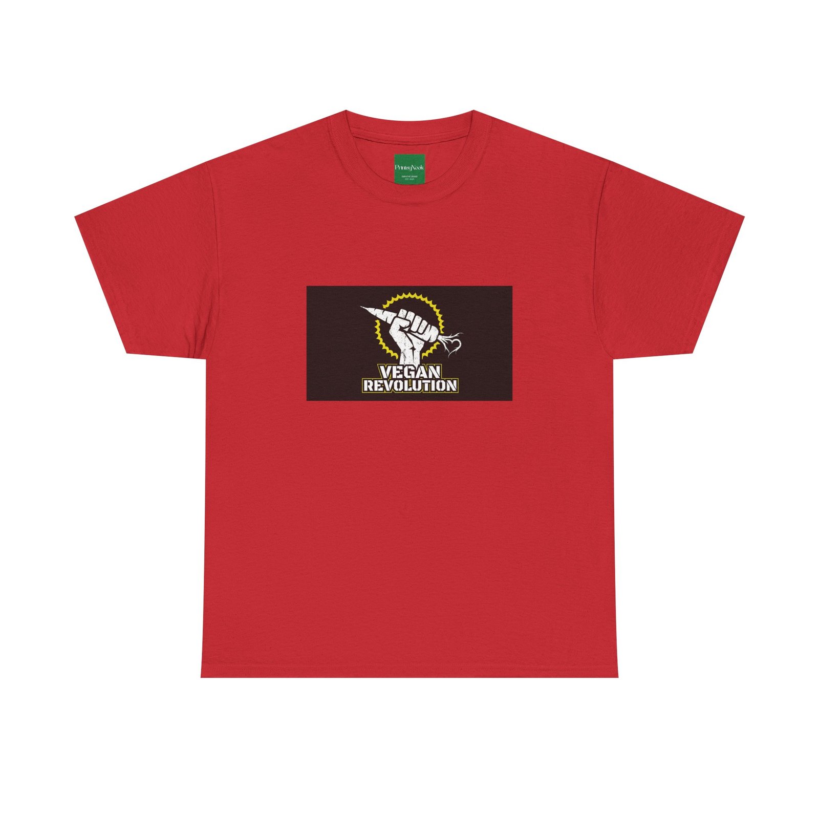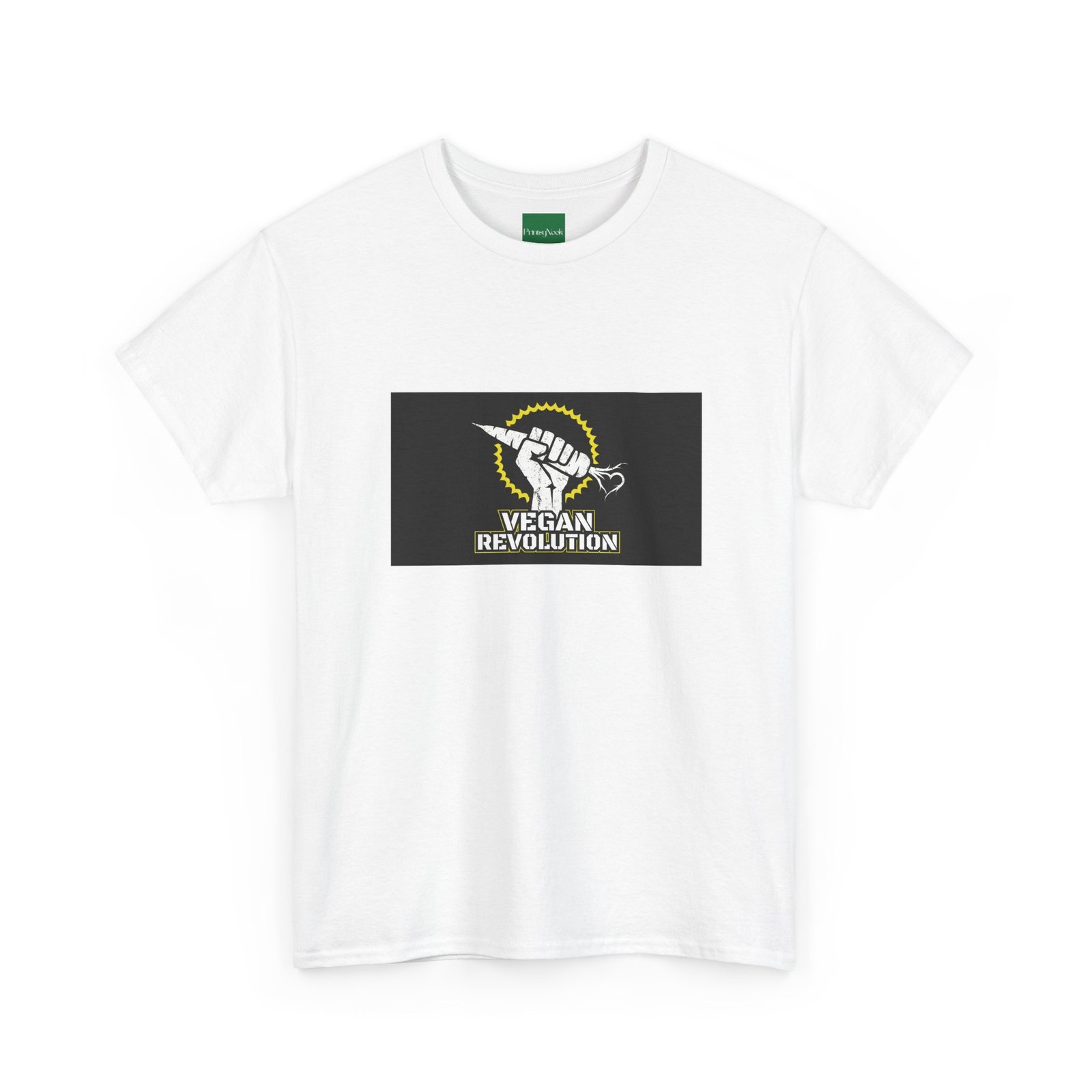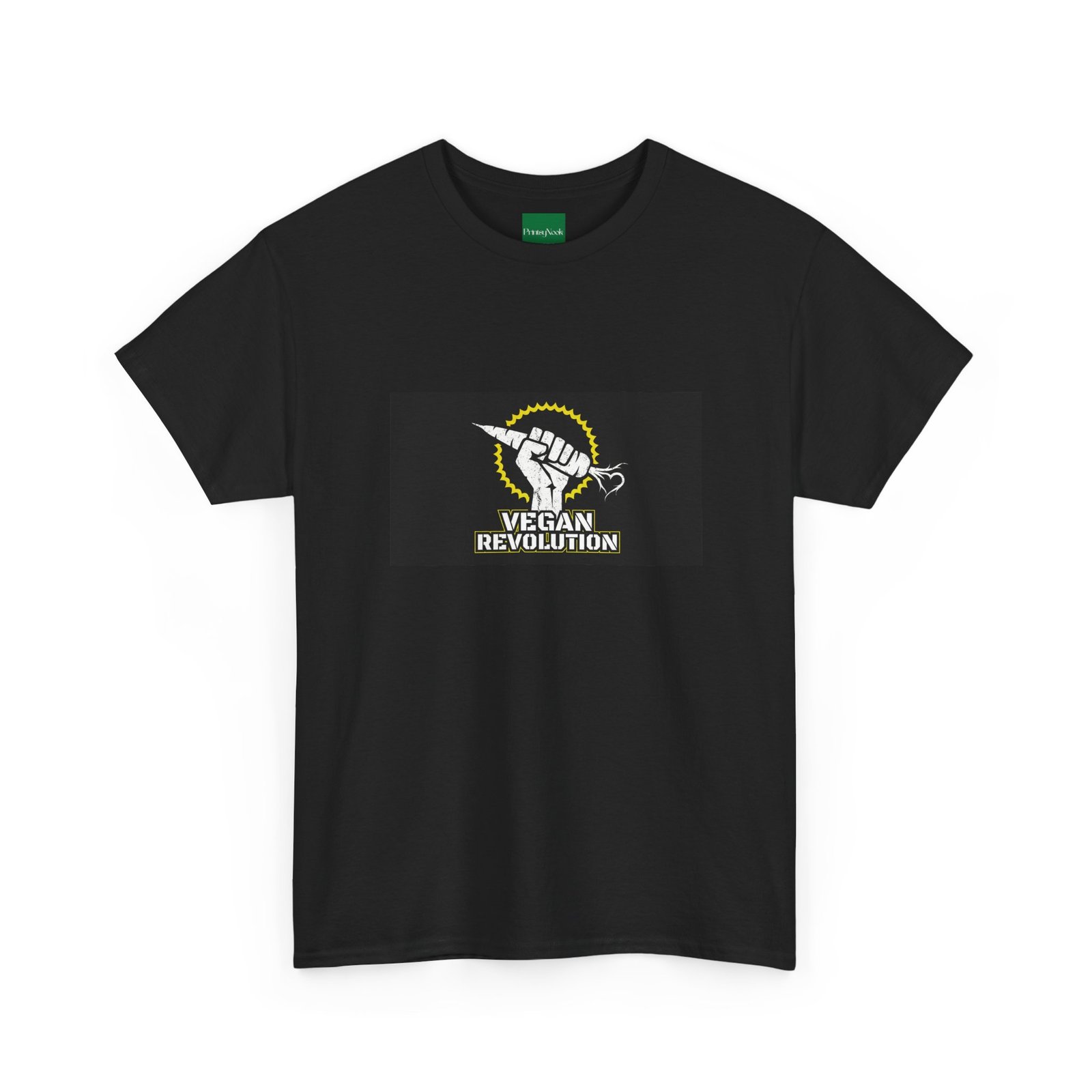 A bold, activist tee made to carry a message without shouting. This classic crew shirt features a centered graphic of a raised fist clutching a carrot under a sunburst, with the words „Vegan Revolution“ beneath — clean, confrontational, and instantly recognizable. The medium-weight cotton feels substantial but breathable, wearing in with you rather than against you. It lays flat and holds shape thanks to ribbed knit at the collar and twill shoulder tape, so the print stays proud wash after wash. Wear it to rallies, farmers‘ markets, or slow Saturdays when you want your values to do the talking. Slight natural flecks appear on the unprocessed colorway for an honest, lived-in look.