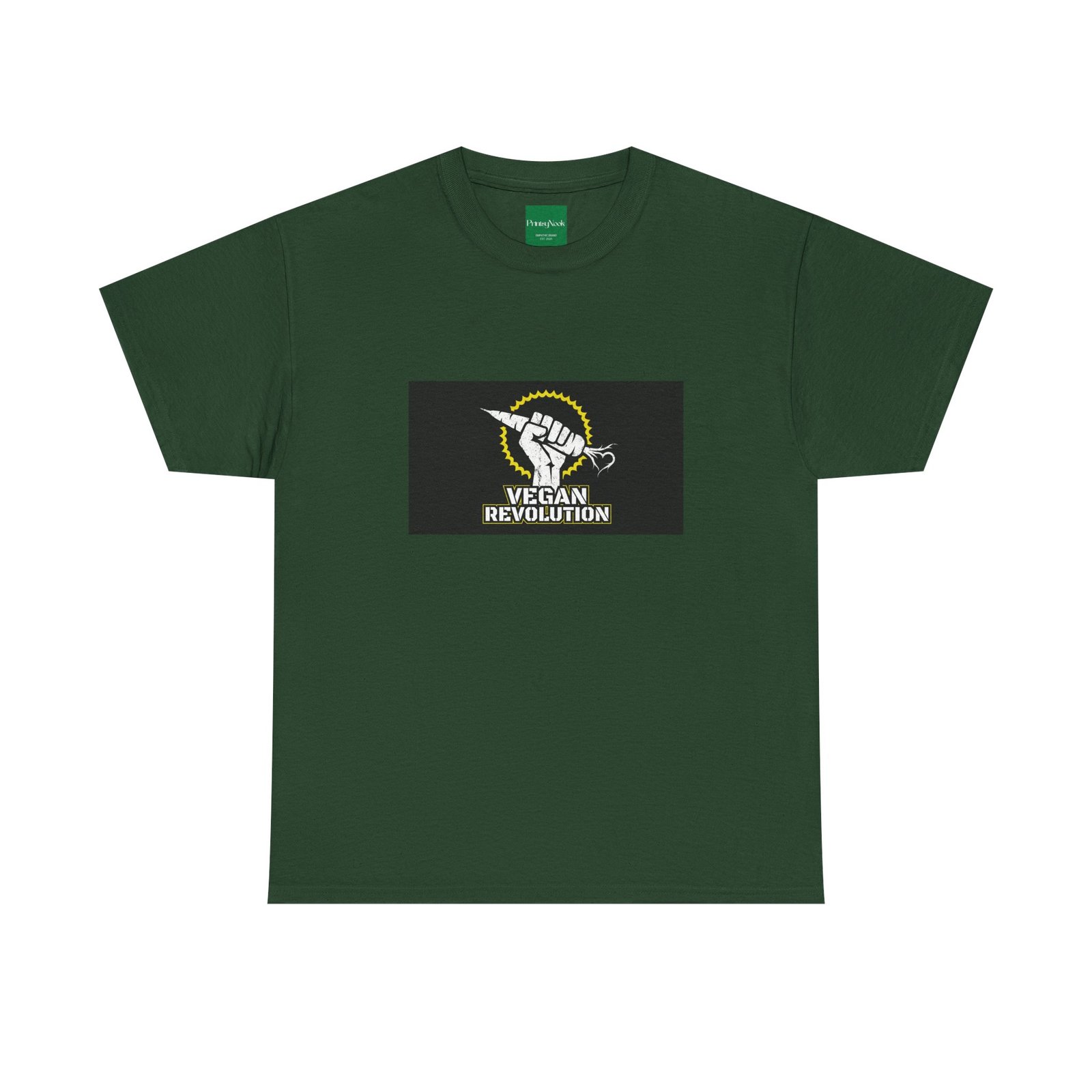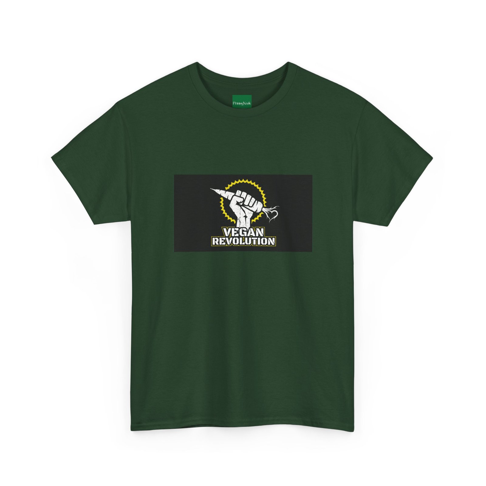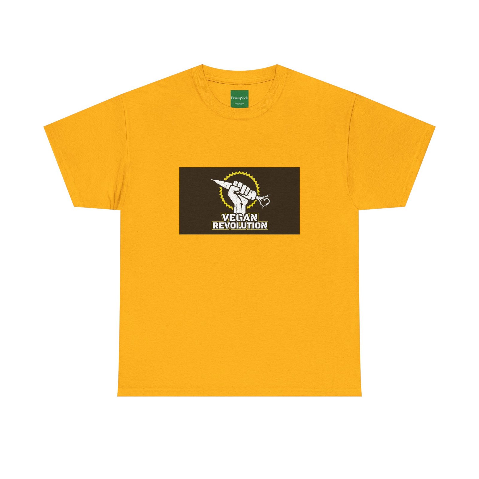 A bold, activist tee made to carry a message without shouting. This classic crew shirt features a centered graphic of a raised fist clutching a carrot under a sunburst, with the words „Vegan Revolution“ beneath — clean, confrontational, and instantly recognizable. The medium-weight cotton feels substantial but breathable, wearing in with you rather than against you. It lays flat and holds shape thanks to ribbed knit at the collar and twill shoulder tape, so the print stays proud wash after wash. Wear it to rallies, farmers‘ markets, or slow Saturdays when you want your values to do the talking. Slight natural flecks appear on the unprocessed colorway for an honest, lived-in look.